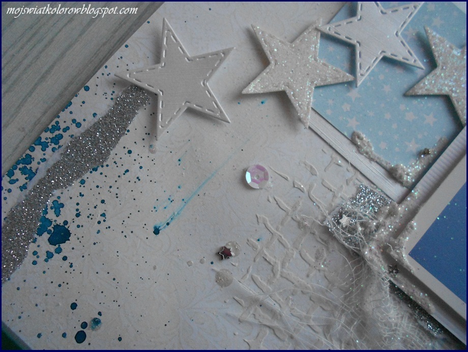 Oj, czego tu nie ma...mgiełki 13art's chalk indigo i pearl clear, białe gesso, brokat, cekiny, papier Galerii Papieru ten , gaza, tusz splash- srebrny, szablon 13 Arts, papier brokatowy i wizytówkowy...