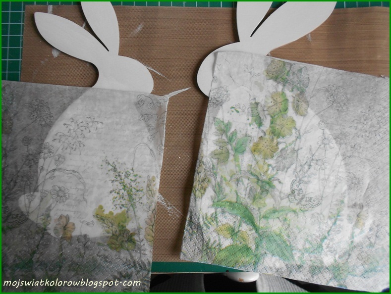 Gdy tylko je zobaczyłam wiedziałam, że będą fajnie wyglądać w serwetkach z łąkowymi motywami, które też można kupić w tym samym sklepie. Zresztą bardzo lubię zaopatrywać się w Zielonych Kotach w różne potrzebne rzeczy, mają duży wybór w tematyce scrapbookingu i decoupage. Ale wracając do moich zajączków to prezentują się tak: